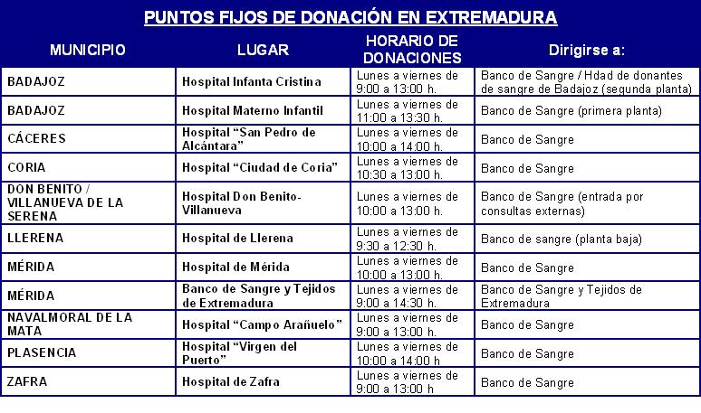 Las diferente unidades móviles realizarán las extracciones: el día 3 lunes en Pueblonuevo de Miramontes, Casa de la Cultura de 18:30 a 22:00 horas; el día 10 lunes en Almaraz, C. N. A. de 10:00 a 14:00 y de 16:00 a 20:00 horas; el día 17 lunes en Talayuela, Centro de salud de 17:30 a 21:30 horas; el día 26 miércoles en Rosalejo, Casa de la cultura de 18:00 a 22:00 horas; el día 29 sábado en Majadas, Casa de la cultura de 17:30 a 21:30 horas; el día 29, sábado en Garganta la Olla, Casa de la cultura de 18:00 a 21:30 horas y el día 31 lunes en Jarandilla de la Vera, Casa de la Cultura de 18,00 a 22,00 horas.